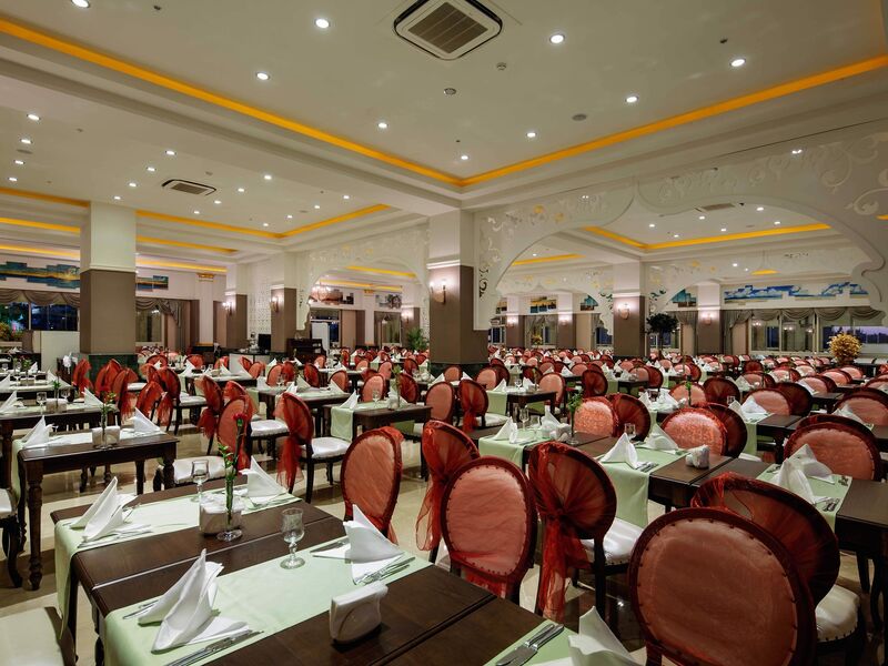 Sabah, öğle ve akşam açık büfe yemekler ücretsiz. Tesisin belirlemiş olduğu markalar dahilinde yerli alkollü ve alkolsüz içecekler 24 saat, tesisin belirlemiş olduğu yabancı alkollü ve alkolsüz içecekler ise 10.00-01.00 saatleri arasında ücretsiz. Taze sıkılmış portakal suyu kahvaltıda ücretsiz. Özel kanyak, 12 ve 15 yıllık viski çeşitleri, özel yerli ve yabancı şaraplar, taze sıkılmış meyve suları ve 01.00-10.00 saatleri arasında verilen tüm yabancı içecekler ücretli.